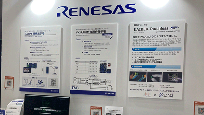 今回、ルネサスエレクトロニクス社は、ハードウェアはもちろんソフトウェアまで実演デモで体感できる「小さく始めるAIパビリオン」に、世界有数の半導体メーカー4社の一員として出展されていました。