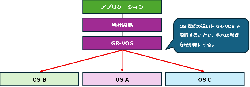 当社製品を様々なOSで使用するために、橋渡しのような機能を定めたのがGR-VOSになります。GR-VOSの実装を変更することで当社製品を様々なOSでご使用できるようになっています。