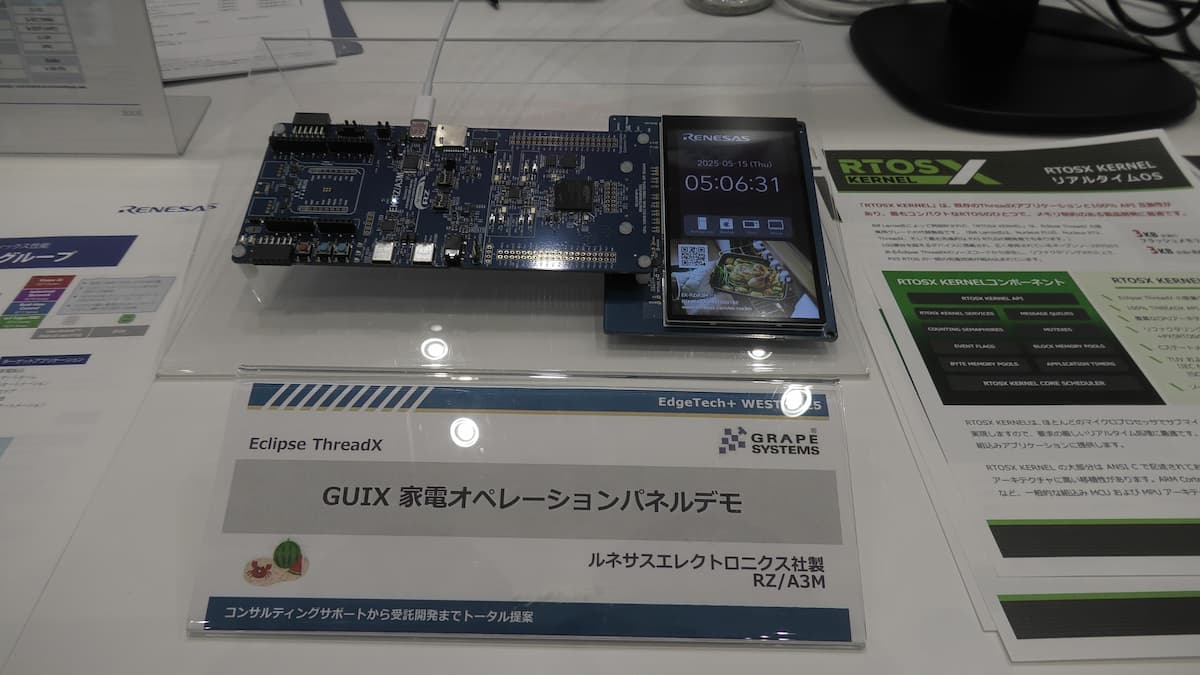 1つは、ルネサスエレクトロニクス社のRZ/A3Mを利用し、AzureRTOS (Eclipse ThreadX) 上に、GUIツール「GUIX」を使用して、直感的で見やすいインターフェースを実現したデモです。